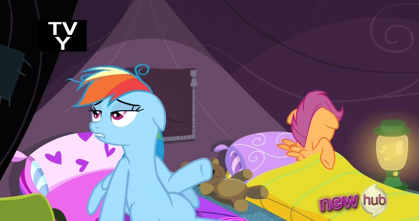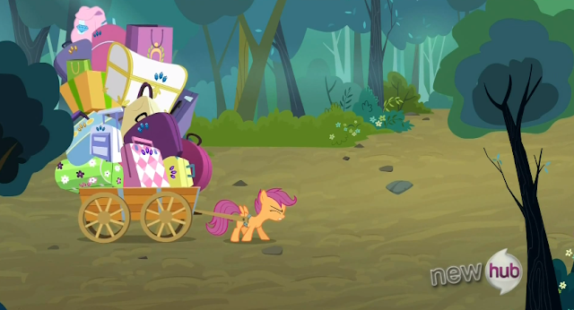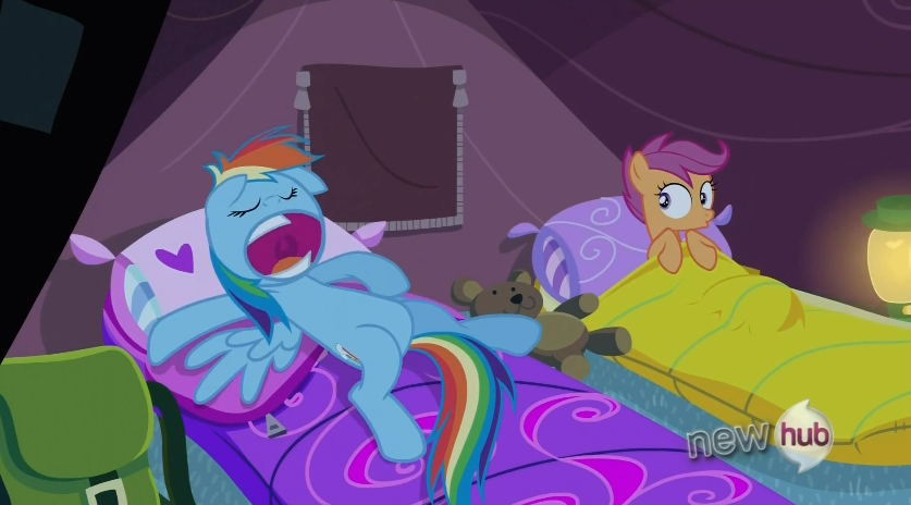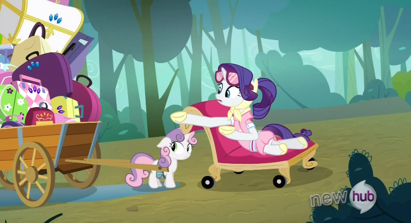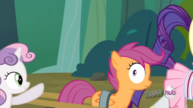 RD is facinated with her leg, Scoot ate some mushrooms, and Sweetie Belle was just told they are at the wrong campsite.