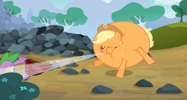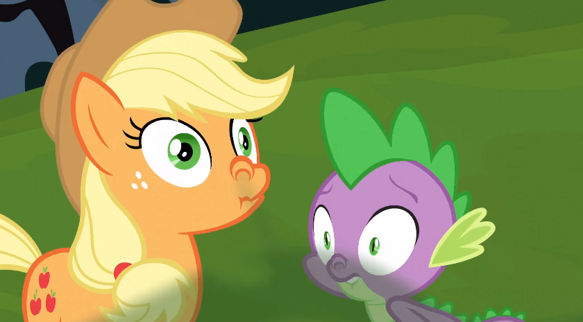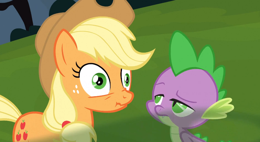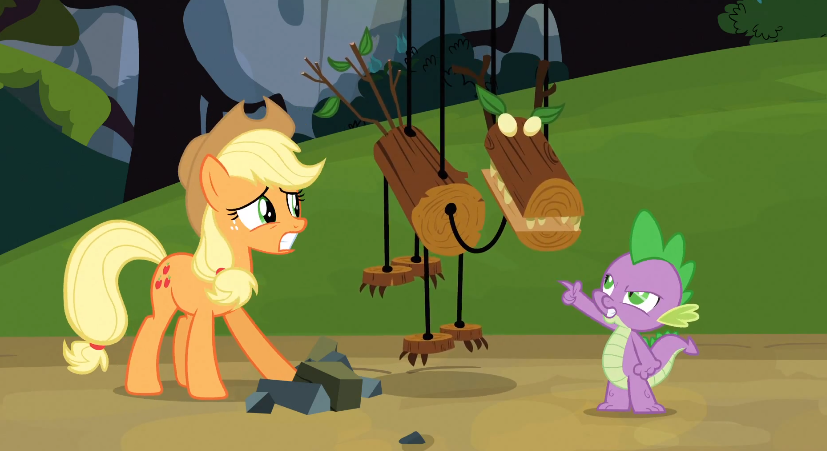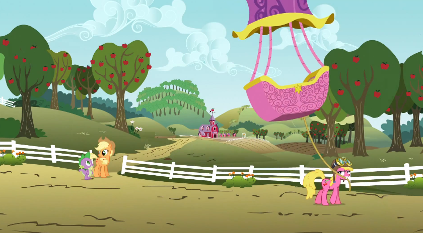 Even Spike is confused how AJ is tying a hot air balloon to her tail.