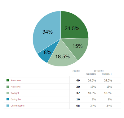 here are the results of the first real poll. Chromosome wiped-out the competition (probably by giving them a one way trip in the moon cannon). Scootaloo came in behind Chromosome as Best (canon) Pony, followed by Twilight, Pinkie, then Daring Do (sorry Trig)...